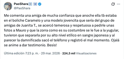 “Me comenta una amiga de mucha confianza que anoche ella tb estaba en el boliche Caramelo y una modelo jovencita que sería del grupo de amigas de Juanita T., se acercó temerosa y respetuosa a pedirle unas fotos a Mauro”, comenzó explicando la usuaria en sus redes. La actitud de esta modelo, cauta al parecer, era tanto por la seguridad como para también no interrumpir la atmósfera y la tranquilidad que tenían Icardi y la China en el boliche.