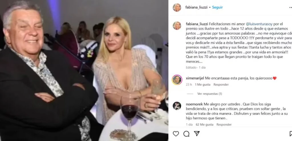 Orgullosa de su compañero de vida y a fin de felicitarlo por el reconocimiento que le hicieron en medio de los Martín Fierro Federal, Fabiana puso una foto junto al presidente de APTRA y escribió: “Felicitaciones mi amor @luisventurasoy por el premio”.