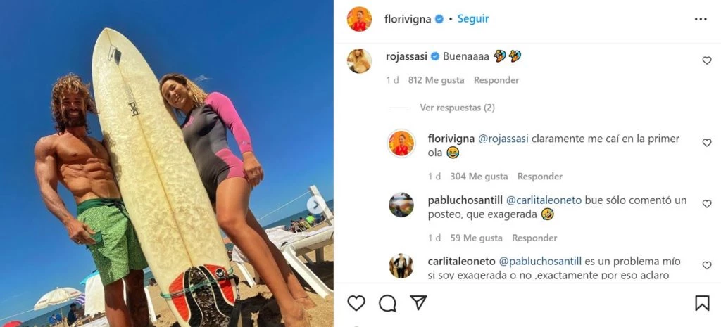 Rápida de reflejos, al ver la foto Sabri dejó su comentario, aplaudiendo la aventura en las olas a la que se animaron los dos. “Bueeena”, felicitó a Vigna, sumando emojis de tablitas de surf.