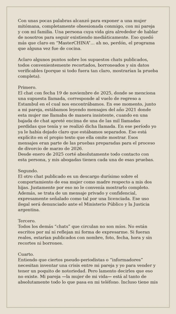 “Con unas pocas palabras alcanzó para exponer a una mujer mitómana, completamente obsesionada conmigo, con mi pareja y con mi familia. Una persona cuya vida gira alrededor de hablar de nosotros para seguir existiendo mediáticamente. Eso quedó más que claro en 'MasterCHINA'… ah no, perdón, el programa que alguna vez fue de cocina”, arrancó el futbolista.