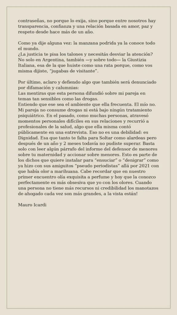 "Segundo. El otro chat publicado es un descargo durísimo sobre el comportamiento de esa mujer como madre respecto a mis dos hijas. Justamente por eso no le convenía mostrarlo completo. Además, se trata de un mensaje privado y confidencial, expresamente señalado como tal por una licenciada. Ese uso ilegal será denunciado ante el Ministerio Público y la Justicia argentina", advirtió Icardi.
