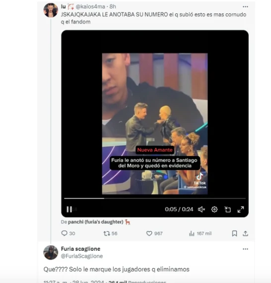 "Le anotaba su número...", rezaba un posteo al que se sumó Furia. Ahí, la doble de riesgo se cansó y explicó la realidad de ese momento con del Moro: "¿Qué? Solo le marqué los jugadores que eliminamos". De ese modo se desactivaron todas las presunciones de un romance inesperado.