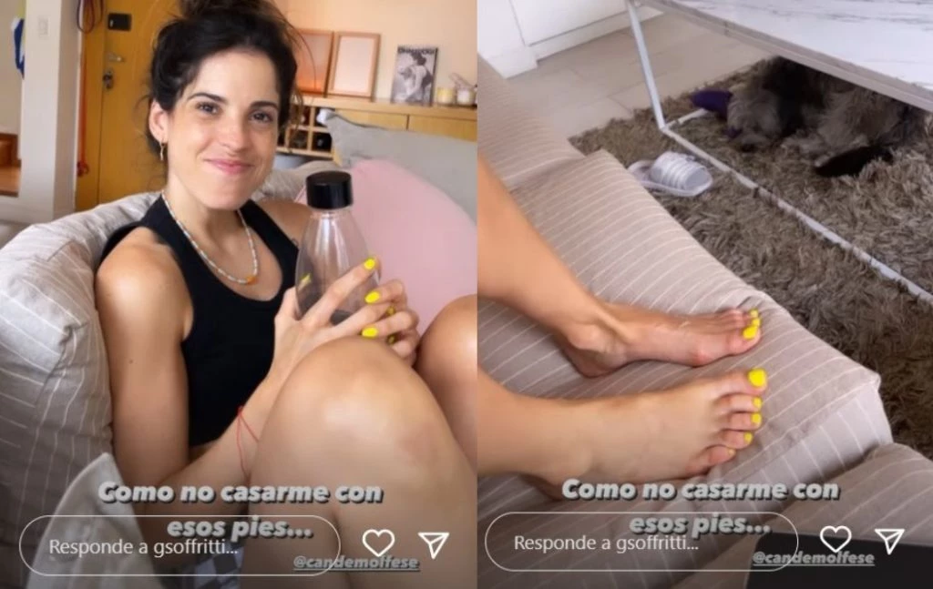 Cara de sorpresa y una amplia sonrisa es todo lo que se ve de parte de Cande. "¿Cómo no casarme con esos pies?", anunció su novio, mientras enfocaba las uñas color amarillo fluorescente de Molfese.