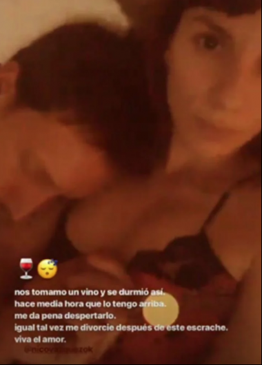 “Nos tomamos un vino y se durmió así”, contó la actriz en sus historias de Instagram y agregó: “Me da pena despertarlo. Igual tal vez me divorcie después de este escrache. ¡Viva el amor!”, cerró divertida.