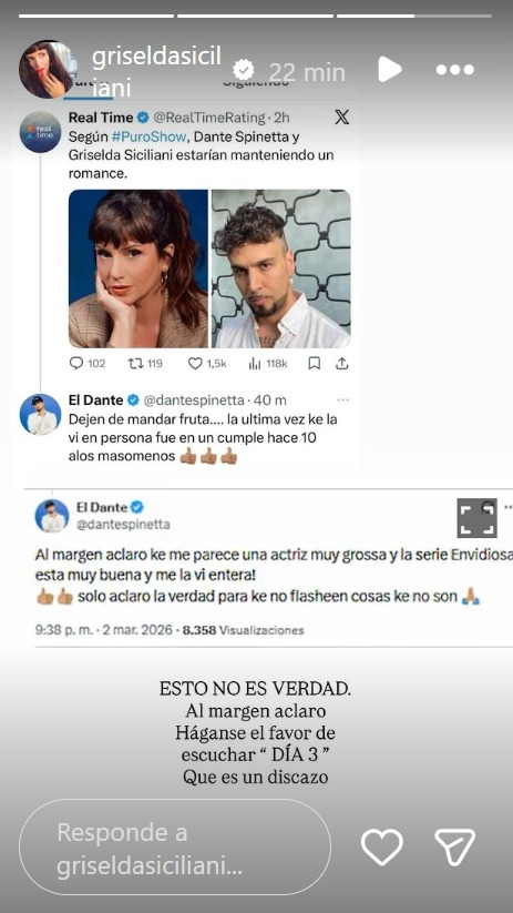 “ESTO NO ES VERDAD. Al margen aclaro, háganse el favor de escuchar “DÍA 3”, que es un discazo”, aseguró Griselda, desde su cuenta de Instagram.