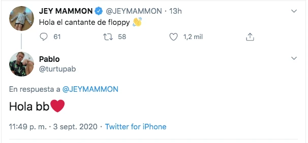 Y ese motivo fue el elogio de Jay, que lo manifestó de manera evidente y contundente. "Hola el cantante de Floppy" escribió en su cuenta de Twitter, con una manito haciendo el gesto del saludo. Ni lerdo ni perezozo, Pablo le devolvió la gentileza. "Hola bb" le puso, pero eso no fue todo: acompañó la respuesta con un corazón rojo. En el lenguaje de las redes, eso significa, como mínimo, "sigamos hablando".