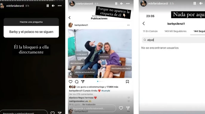 "Barby y El Polaco no se siguen", advirtió una de las seguidoras de Estefi Berardi. Y ella, desde su cuenta de Instagram, contó, sobre las conclusiones a las que llegó tras revisar las cuentas de ambos protagonistas. "Él la bloqueó a ella directamente".