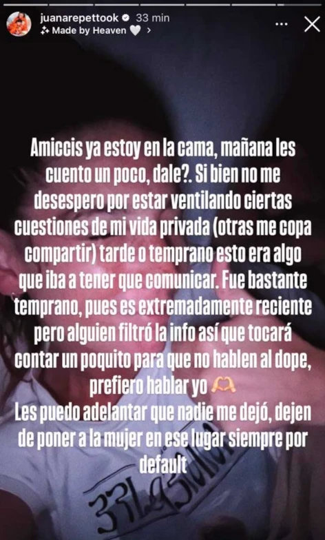 Más tarde, Juanita se expresó desde sus historias de IG, donde adelantó que muy pronto va a contar todo lo que está transitando. “Tarde o temprano esto era algo que iba a tener que comunicar. Alguien filtró la info así que tocará contar un poquito para que no hablen al dope”, dijo.