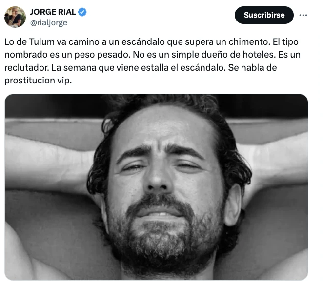 “Lo de Tulum (en donde lo conoció) va camino a un escándalo que supera un chimento. El tipo nombrado es un peso pesado. No es un simple dueño de hoteles. Es un reclutador. La semana que viene estalla el escándalo. Se habla de prostitución vip”, comentó Rial.