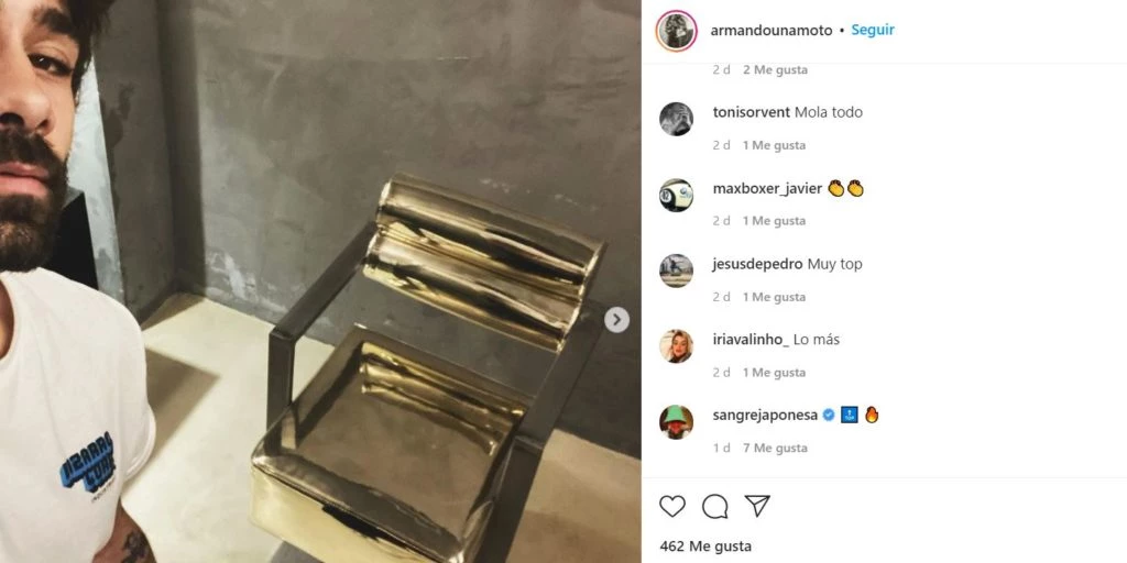 “Foto de mi primera silla. Sigo pensando que es más fácil hacer una moto…”, escribió Mena Navareño junto a una imagen donde se lo ve, muy serio, al lado de la silla que hizo junto a un estudio de diseño, para una peluquería.