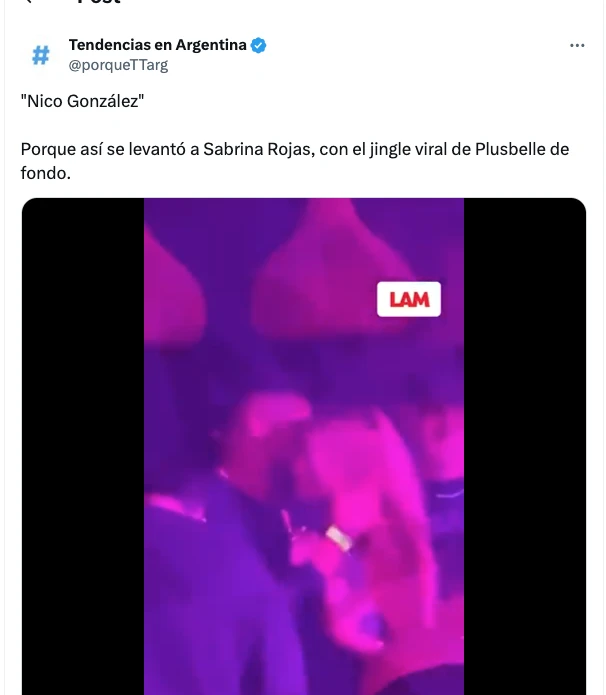 Así se enquistó en el imaginario colectivo esta incipiente historia de amor, por eso en las redes sociales se analizaron todos los detalles y varios usuarios repararon en un detalle increíble: la música de la disco durante la conversa muy íntima de Sabrina y el jugador. De ese modo se transformó en tendencia el video: "Nico González, porque así se levantó a Sabrina Rojas, con el jingle viral de Plusbelle de fondo”.