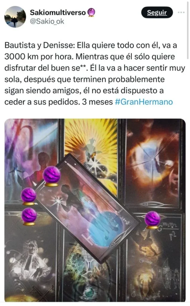 A través de la cuenta de X, el usuario @sakio_ok dio detalles de lo que estima el tarot que pasará con esta pareja que supo ganarse la atención de muchos de los televidentes del reality show. incluso, algunos de ellos se ilusionaron con las distintas muestras de "cariño" que Bautista hizo, en cámara, por Denisse.