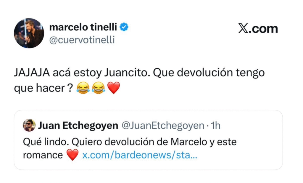 ¿Y cómo se lo tomó Marcelo? Con desconcierto. “Qué lindo. Quiero devolución de Marcelo y de este romance”, comentó el periodista Juan Etchegoyen en X, etiquetando al empresario, que andaba perdidísimo. “Jajaja Acá estoy, Juancito. ¿Qué devolución tengo que hacer?”. “Qué lindo tener una hija enamorada. ¿Sensaciones?”, lo pinchó Juan, a lo que Tinelli, tajante, contestó: “No me contó nada. Me enteré por el stream con Tommy anoche”.