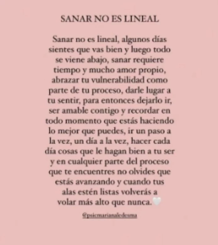“Sanar no es lineal, algunos días sientes que vas bien y luego todo se viene abajo, sanar requiere tiempo y mucho amor propio, abrazar tu vulnerabilidad como parte de tu proceso, darle lugar a tu sentir, para entonces dejarlo ir", compartió Ailén en un primer fragmento del escrito poético.