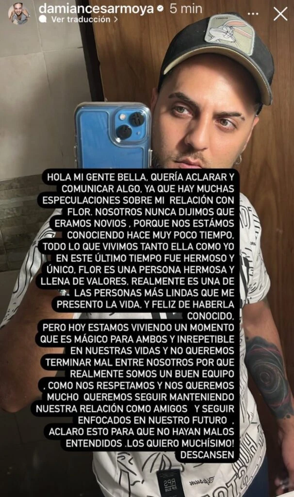 “Hola mi gente bella, quería aclarar y comunicar algo, ya que hay muchas especulaciones sobre mi relación con Flor. Nosotros nunca dijimos que éramos novios, porque nos estamos conociendo hace muy poco tiempo, todo lo que vivimos tanto ella como yo en este último tiempo fue hermoso y único, Flor es una persona hermosa y llena de valores, realmente es una de las personas más lindas que me presento la vida, y feliz de haberla conocido”, sostuvo Damián.