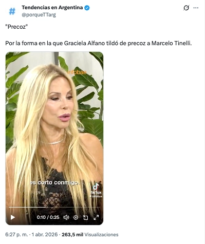 Lo cierto es que Alfano no dio detalles de cuándo realmente sucedió ese encuentro con Tinelli, pero sí lo dejó bastante expuesto respecto a su desempeño y en las redes sociales lo destrozaron. De hecho una popular cuenta de X tituló el fragmento con un demoledor “precoz”, en alusión a esa historia de amor de la actriz y el conductor que duró “unos minutos”. ¡Tremendo!