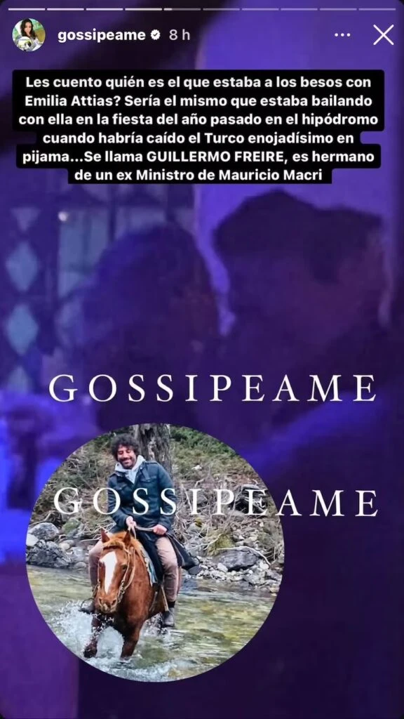 “Emilia Attias llegando ayer a Caix con un hombre de la mano… ¿será Guillermo Freire? Me da que sí”, escribió la influencer en la imagen en la cual se puede ver a la rubia de espaldas y otras personas que la rodeaban en ese momento. “¿Les cuento quién es el que estaba a los besos con Emilia Attias? Se llama Guillermo Freire, es hermano de un ex ministro de Mauricio Macri”, había contado la instagramer hace unos días.