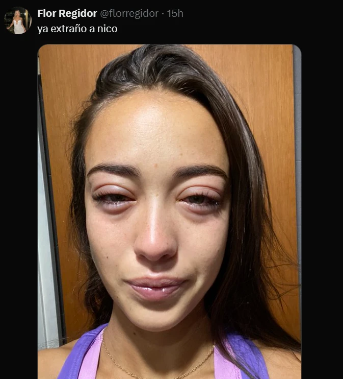 Pero la distancia de Buenos Aires y, sobre todo, el frío polar, potenciado en la Patagonia, ya empezó a pesarle a Flor, que sorprendió a los usuarios de Twitter con una foto de su rostro desfigurado del llanto en versión mega dramática que causó sorpresa y dudas sobre su relación con Nicolás Grosman.