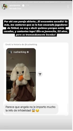 Ante tamaña información, y calibre, las miradas se direccionaron a Ángela, con el objetivo de conocer su percepción de los rumores. Así, Rusherking salió a contestar con una foto muy jugada, en la que Torres se encuentra en su cama, con un remerón y poca ropa abajo y un peluche. Por eso, Gossipeame conjeturó: . “Parece que a Ángela no le importó mucho la info de infidelidad. Por ahí son pareja abierta, ¡el encuentro sucedió!”.