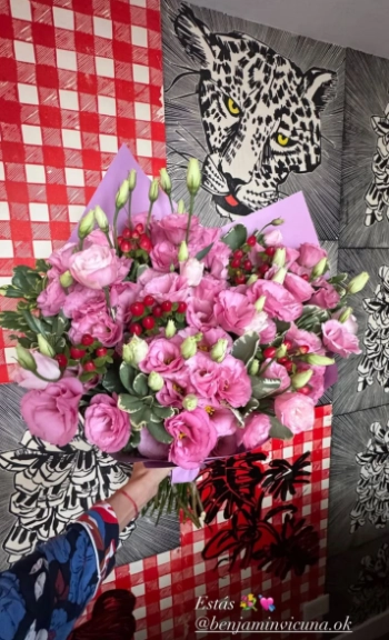 Pero la noche no terminó ahí, porque los detalles románticos y la atmósfera de la pareja se siguió alimentando con el correr de las horas. Así fue como, poco después del recital, la empresaria mostró un ramo de rosas blancas y rosadas que el chileno le dio como regalo. Y allí ella escribió: “Estas flores”, para luego arrobar en su posteo a Benjamín.