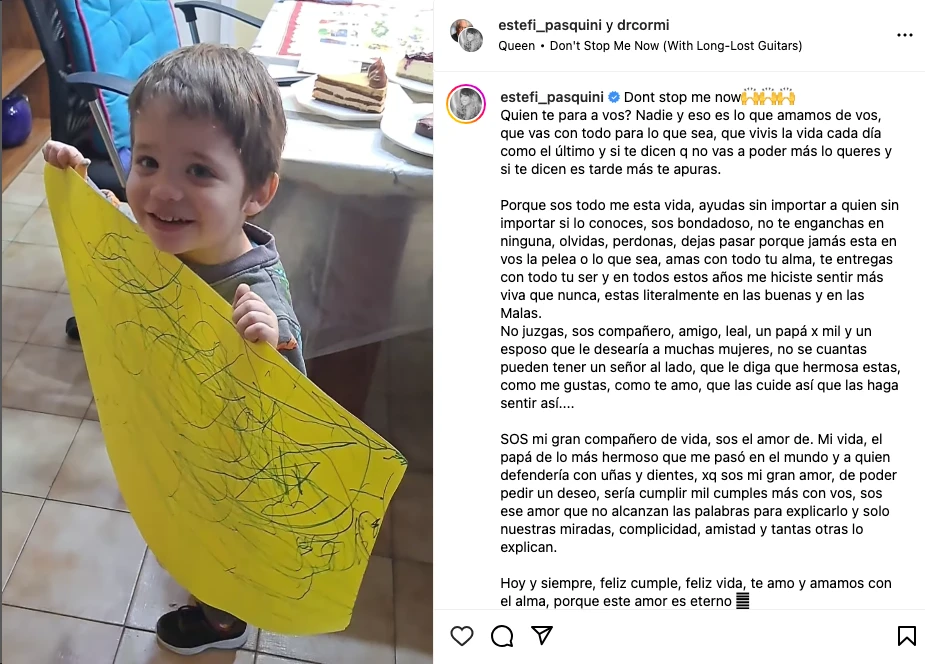 “Sos mi gran amor, de poder pedir un deseo, sería cumplir mil cumples más con vos, sos ese amor que no alcanzan las palabras para explicarlo y solo nuestras miradas, complicidad, amistad y tantas otras lo explican. Hoy y siempre, feliz cumple, feliz vida, te amo y amamos con el alma, porque este amor es eterno", sentenció Pasquini con un tierno video y las muestras de afecto de sus seguidores no tardaron en aparecer.