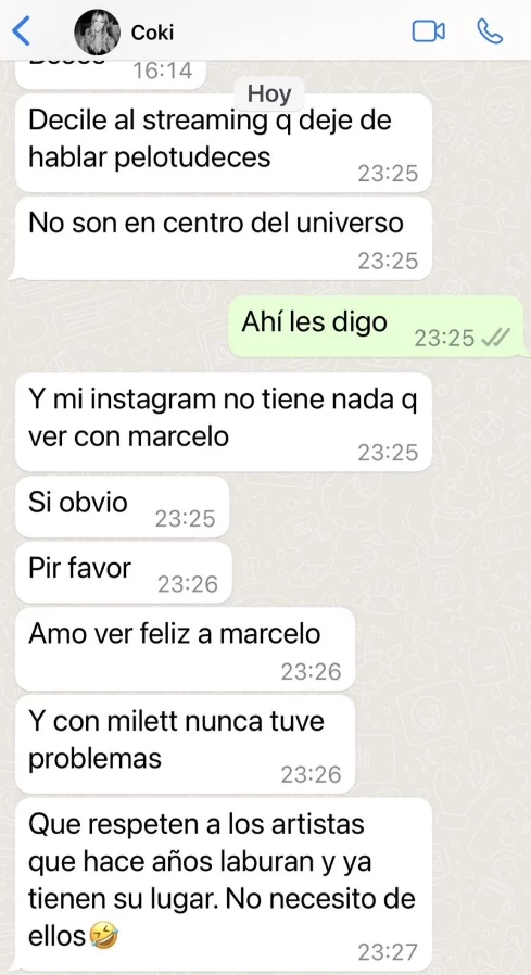"Decile al streaming que deje de hablar pelotudeces. No son el centro del universo y mi Instagram no tiene nada que ver con Marcelo", disparó Coki. Y cerró: "Amo ver feliz a Marcelo Tinelli y con Milett Figueroa nunca tuve problemas. Que respeten a los artistas que hace años laburan y ya tienen su lugar. No necesito de ellos".