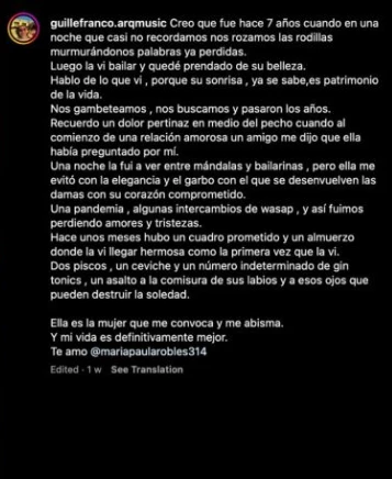 Sobre cómo lograron reencontrarse con Paula Robles, Guillermo Franco comentó en su posteo: “Hace unos meses hubo un cuadro prometido y un almuerzo donde la vi llegar hermosa como la primera vez que la vi. Dos piscos, un ceviche y un número indeterminado de gin tonics, un asalto a la comisura de sus labios y a esos ojos que pueden destruir la soledad”.