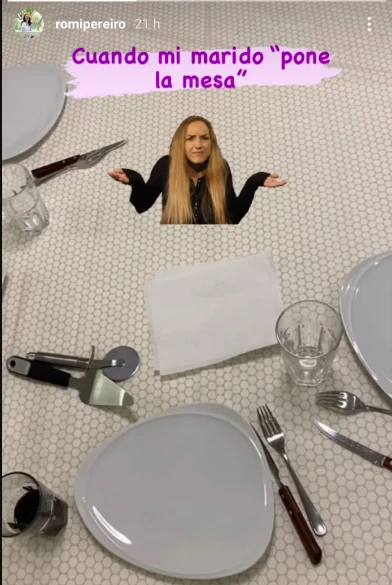 "Cuando mi marido pone la mesa" escribió Pereiro sobre la foto de una mesa "algo triste", por llamarla de alguna manera. La acompañó con la imagen de una mujer haciendo un gesto de pregunta. Algo así como "¿Pero qué hiciste?". Parecía una mesa preparada para comer una pizza. Ademas de los cubiertos se veía una "cortadora" de porciones y una "pala" o "espátula" para levantarlas.