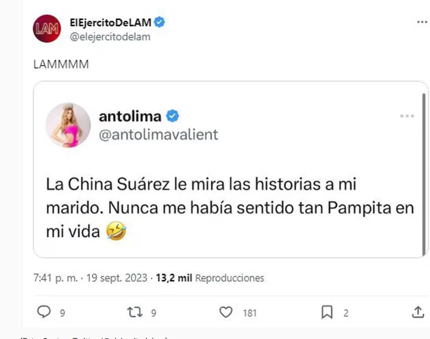 “La China Suárez le mira las historias a mi marido. Nunca me había sentido tan Pampita en mi vida”, publicó Anto en un explosivo mensaje en Twitter en las las últimas horas. Como era de esperarse, despertó todo tipo de comentarios porque, claro, a la China la "condena el pasado".