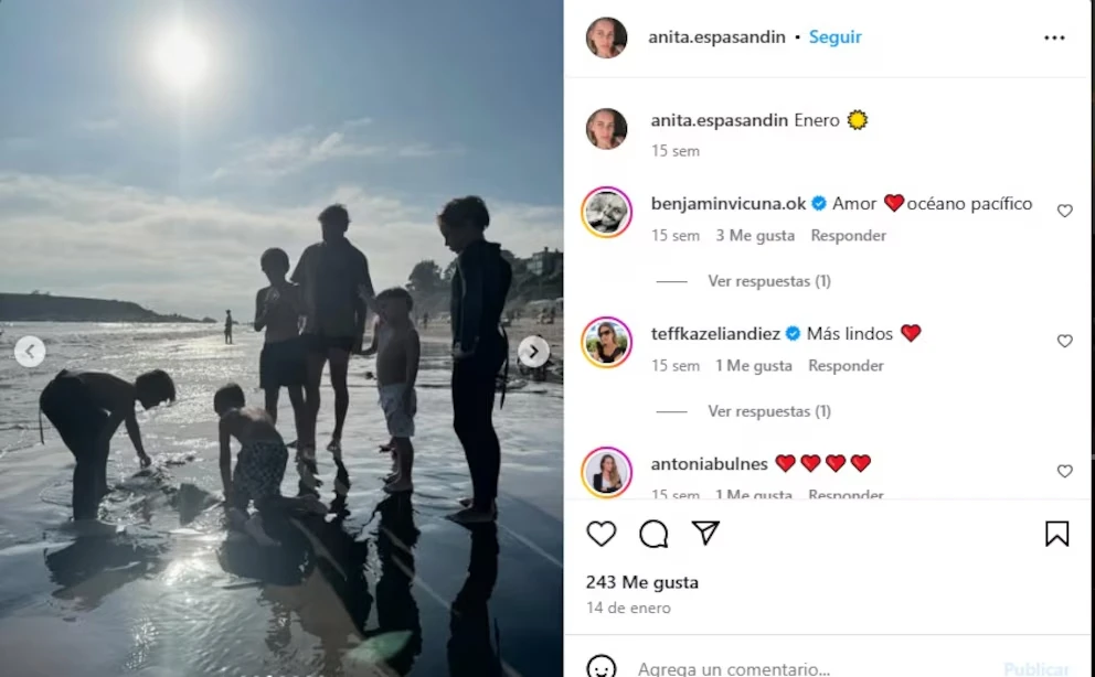 La mayoría de las publicaciones mostraron a la pareja en Europa, durante su visita a España. Anita compartió fotos en la alfombra roja y también en rincones turísticos de Madrid y Málaga. “Hermoso viaje, mejores recuerdos”, escribió junto a una postal tomada frente al mar. Benjamín comentó con un simple corazón rojo, fiel a su estilo reservado.
