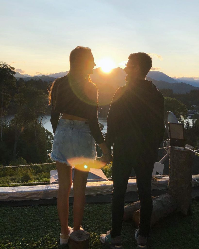 Es así que el ex integrante de Patito Feo publicó una romántica postal en su cuenta personal de Instagram, donde se lo ve de la mano con su compañera, observando el atardecer ante el imponente paisaje compuesto por el lago y los cerros del lugar.