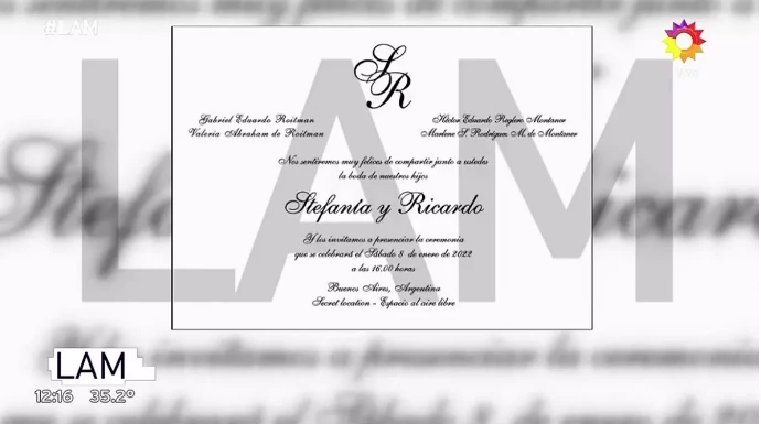 “Los invitamos a presenciar la ceremonia, que se celebrará el sábado 8 de enero del 2022, a las 16 horas en Buenos Aire, Argentina. O sea, el lugar secreto, como ven ahí en la invitación, espacio al aire libre. No quieren anunciarlo a sus invitados todavía para que no se filtre”, leyó Angel de Brito, que enuncia la convocatoria.