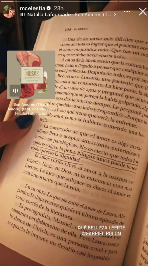 Aunque ella no tomó la misma determinación, una vez más encendió las alarmas al compartir el fragmento de un libro que estaba leyendo. El mismo era uno del reconocido analista Gabriel Rolón, y hablaba sobre poner límites en una pareja.
