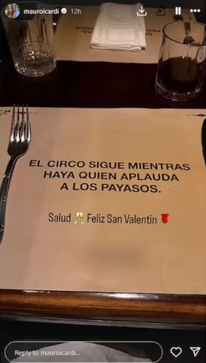“El circo sigue mientras haya quien aplauda a los payasos”, decía la frase en cuestión del mantel, algo que sin dudarlo el delantero rosarino lo utilizó para pegarle a la empresaria. Así las cosas, Icardi tomó la fotografía de la frase y la compartió en sus historias de Instagram con un irónico texto: “Salud, Feliz San Valentín”.