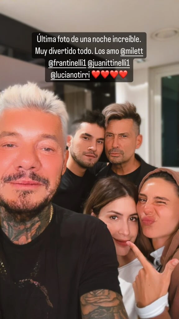 A continuación, Tinelli subió una selfie con su pareja, a quien definió del mismo modo que a su hija. “Mi compañera, mi amor”, dijo el bolivarense, y sumó un idéntico corazón rojo. Luego, sumó una imagen de todo el grupo: “Última foto de una noche increíble. Muy divertido todo. Los amo Milett, Fran, Juani y Luciano”.