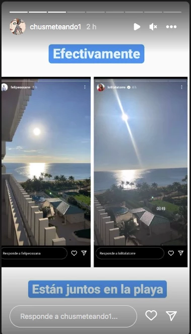 La cuenta Chusmeteando se percató de esta singularidad y compartió en su perfil las stories de Lolita y Felipe, que lucen absolutamente iguales. Con ese indicio se puede corroborar que los tortolitos se acomodaron en ese edificio frente a la playa de Miami, por ende que están juntos en esta aventura turística.