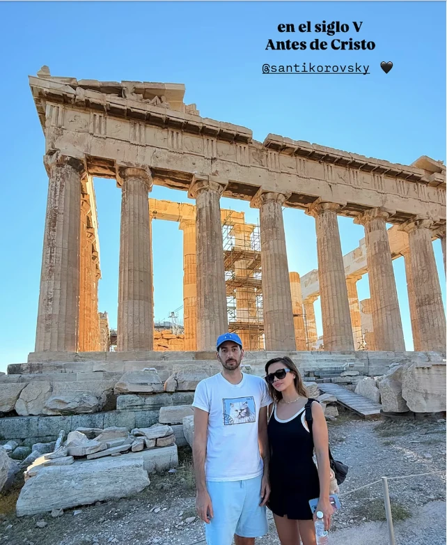 Así se los ve envueltos en la contemplación de sitios arqueológicos de tremendo simbolismo, con atuendos livianos, acordes a la época estival del hemisferio norte. Brilla su piel, sus ojos transmiten amor, así transita este presente la bella Celeste, de la mano de Santi.