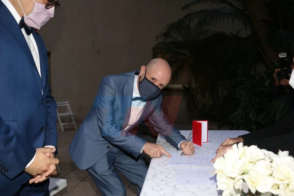 A pesar de haberse ajustado a los protocolos necesarios gracias a la pandemia que corre a causa del coronavirus, la feliz pareja se mostró sonriente para las cámaras y estuvieron acompañados únicamente por sus testigos, siendo el mejor amigo del periodista y la sobrina del asistente terapéutico.