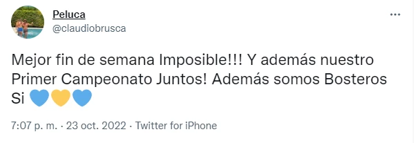 Luego, Peluca eligió Twitter para expresar sus sentimientos y el mensaje parece estar dirigido a Laurita: "Mejor fin de semana, imposible. Y, además, nuestro primer campeonato juntos. Además, somos bosteros, sí", escribió el productor.