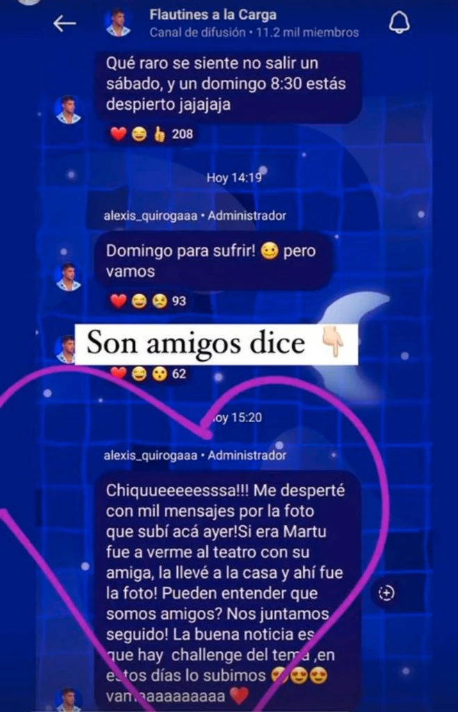 “Sí era Martu, fue a verme al teatro con su amiga, la llevé a la casa y ahí fue la foto. ¿Pueden entender que somos amigos? Nos juntamos seguido”, comentó Quiroga, quien luego evadió lo que ocurría para anunciar que junto a ella estrenarán un challenge de su nueva canción.