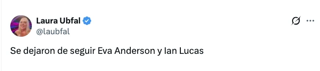 “Se dejaron de seguir Eva Anderson y Ian Lucas”, sostuvo la periodista en su cuenta de X. Ante la enorme repercusión que tomó esta noticia, se despertó cierta confusión entre ellos, quienes a las horas volvieron a seguirse en Instagram.