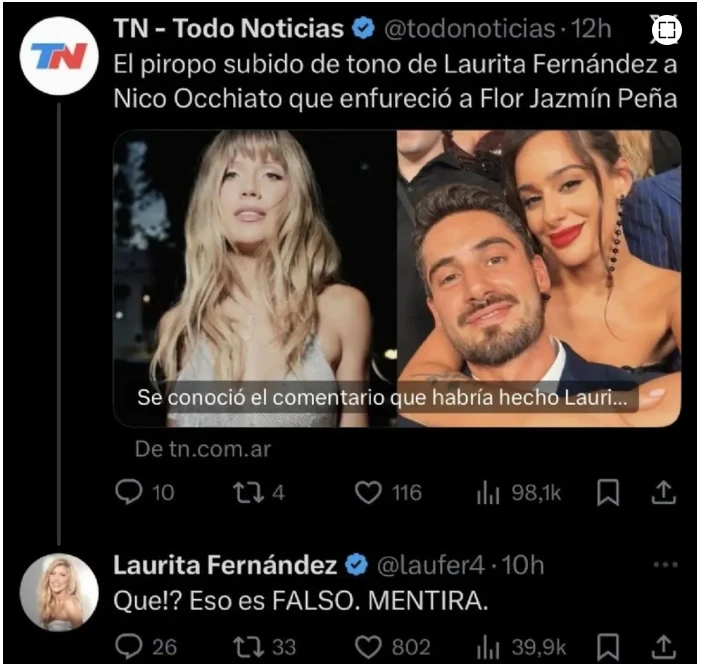 Tal revuelo adquirió la versión que instaló Yanina que la propia ex de Nicolás Cabré tomó cartas en el asunto y decidió aparecer en el plano público a narrar su verdad, a brindar su versión de los hechos. Por eso, la blonda se paró en un tuit que rezaba: “El piropo subido de tono de Laurita Fernández a Nico Occhiato que enfureció a Flor Jazmín Peña”.