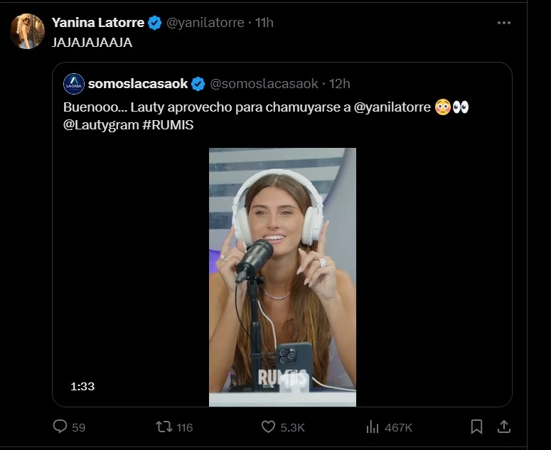 “Por morbo, elijo a Yanina Latorre, con todo el respeto a tu papá. Qué pasaría si un día me ves con ella. Esto obvio con todo el respeto del mundo porque acá está tu hija. Tengo chats hace un montón diciendo que me gustaría estar con vos", dijo Lauty al aire de Rumis, en el streaming, cuando Lizardo Ponce llamó, en vivo, a la conductora interina de LAM.