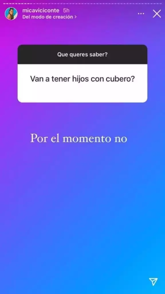 Habilitando el bloque de preguntas en sus historias de Instagram para que sus seguidores le hagan las dudas que tenían sobre su vida privada y laboral, la exchica Combate recibió cientos de consultas sobre su posible embarazo, por lo que decidió elegir una que citaba: “¿Vas a tener hijos con Cubero?”