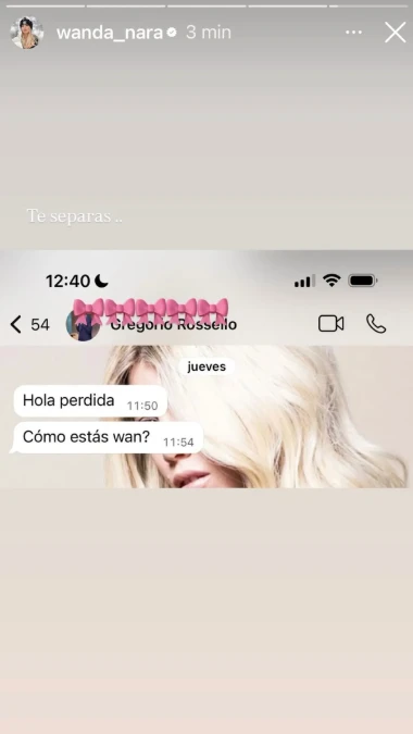 Con el corazón nuevamente libre, Wanda sorprendió en sus redes sociales con una imagen irónica, graciosa y hasta con aires de provocación. Desde sus historias, compartió una captura de una conversación de WhatsApp que no pasó desapercibida. Allí podía leerse un mensaje directo y sin vueltas: “Hola perdida”. Debajo, el remitente insistía con un “¿Cómo estas Wan?”.
