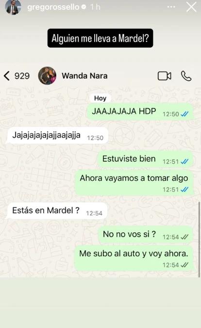 Sobre el final apareció una nueva captura de Grego, donde muestra sus chats con Wanda y pide una mano a su comunidad. “¿Alguien me lleva a Mardel?”, lanzó divertido. Este intercambio no pasó desapercibido para nadie, recordando que meses atrás la mediática había contado públicamente que antes de conocerse en persona él le había escrito un mensaje por redes para acercarse a ella. ¿Romance en puerta? ¿Qué dirá Paloma de esta charla íntima de su novio?
