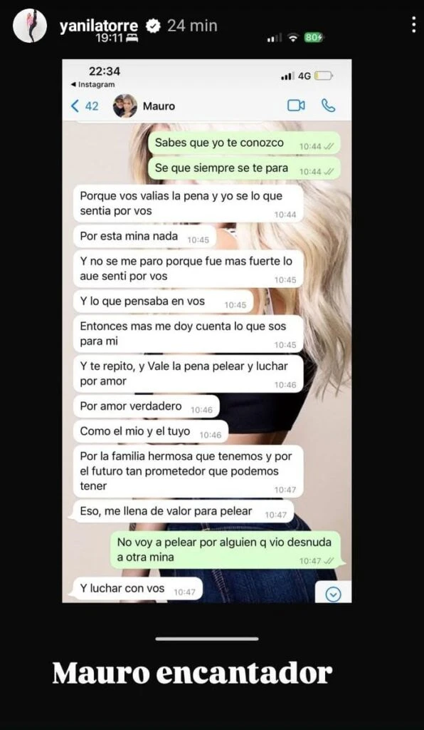 “En este momento voy a empezar a subir todos los chats que tengo de ella y Wanda. Ella fue la que le contó a Wanda cómo se lo gar... a Mauro. Le contó todo. La enloqueció. Esto lo tenía guardado para el juicio, pero hoy le voy a mostrar quién es la China Suárez”, advirtió la panelista de LAM, enfurecida con las acusaciones de la actriz y advirtiendo que todo iba a salir dentro de sus historias de Instagram.