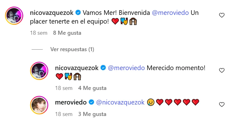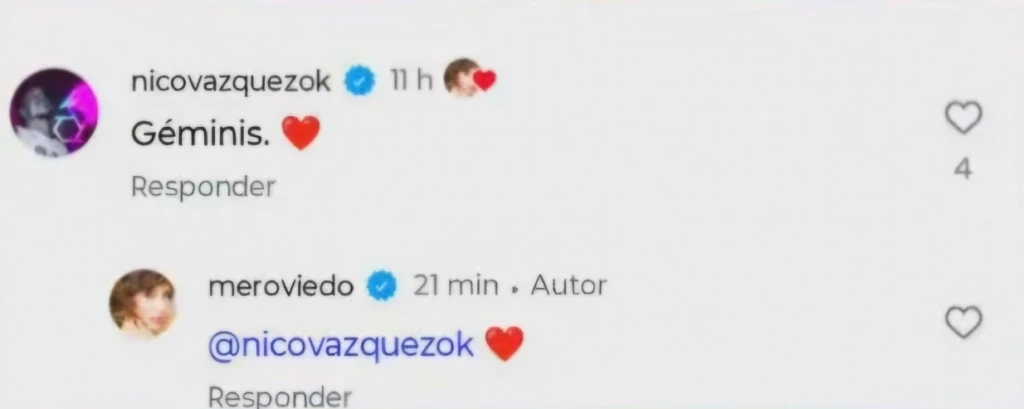 Llama la atención un intercambio en particular entre Nico Vázquez y Mercedes, un ida y vuelta de corazones rojos al mencionar la coincidencia del signo solar de los dos (Géminis) que da qué pensar. Más aún, a la luz del hallazgo que hicieron en Pasó en América sobre un mensaje que data de hace poco más de un mes.