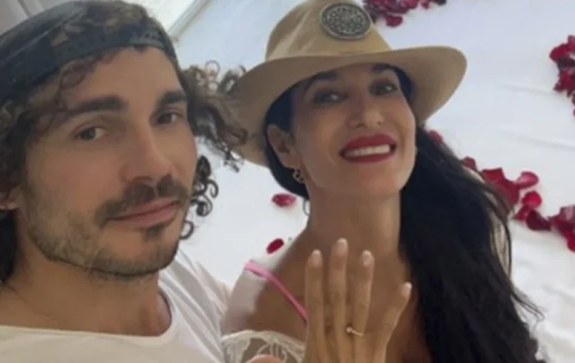 La imagen muestra a Escudero con su futuro esposo en un cuarto de hotel con vista al mar, una cama decorada con pétalos de rosas rojas que forman un corazón y un anillo en su dedo anular, símbolo de que se comprometieron previo al gran paso que darán.