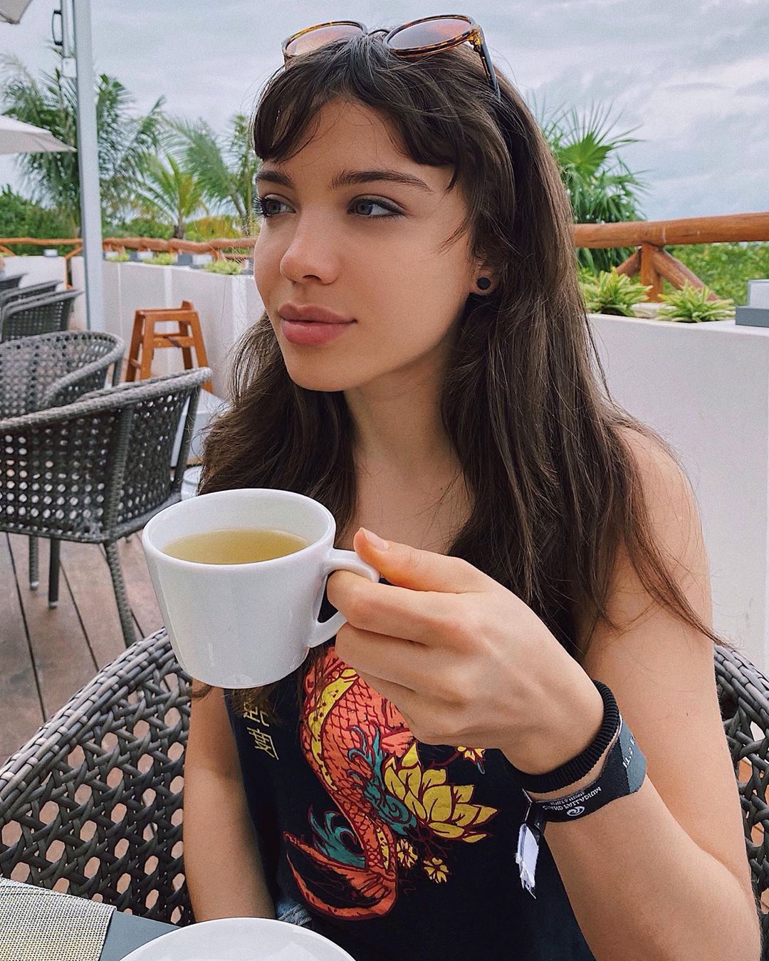 Disfrutando sola de un café en un barcito, o en una salida nocturna en soledad, así son las postales de la bella morocha de ojos azules, pero no ya con su ex compañero de tira.